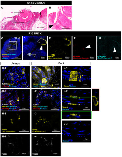 The ligation model, excluding TRiCK mice, was performed with female C57BL/6 mice. Histological analyses of the development of the salivary glands from the oral epithelium of the fetus used E12.0 C57BL/6-J mice, and analyses of the development of the LG from the eyelid conjunctival epithelium used E13.5 C57BL/6-J mice.