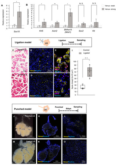 To investigate this hypothesis, we dissociated these exocrine gland cells into single cells and collected the epithelial cells using FACS (Figure S3A). The differences in RNA expression between the two groups of cell populations, one with strong Venus expression and the other with weak Venus expression, were analyzed using quantitative PCR (qPCR). First, the expression level of a neural crest marker Sox10 was compared between the two groups: Sox10 expression in the cells with strong Venus increased more than the weak Venus cells (Figure 4A). We examined the expression of stem cell markers in the epithelial cells during salivary gland regeneration [27]. Expression levels of Keratin5 (Krt5), Axin2, and Bhlha15 (equal to Mist1) were significantly higher in the strong Venus+ cell population than in the low Venus+ cell population. Although expression levels of Sox2 and Kit were not significantly different, high Venus+ cells tended to be higher than low Venus+ cells, as with other genes. A similar tendency in the expression of these three markers, which were significantly upregulated in strong Venus+ cells, was found in both SMG and LG tissues (Figure 4B and Figure S3B).