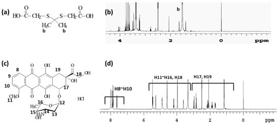 Chemical structure (a) and the 1H NMR spectra (b) of ThdCOOH. Chemical structure (c) and the 1H NMR spectra (d) of DOX HCl.