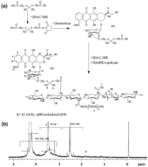 The synthesis scheme (a) and 1H NMR spectra (b) of the ChitoPEGthDOX conjugates.