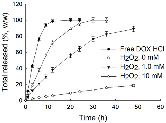 ChitoPEGthDOX nanoparticles in the aqueous solution were spherical (Figure 4A(a)). The diameter of the nanoparticles was approximately 100 nm. The particle size distribution of the nanoparticles was monomodal and narrow (Figure 4B(a)). These results were quite similar to the results in Table 1. Since the thioketal linker has ROS-sensitive properties and can be degraded by oxidative stress [29], hydrogen peroxide was added to the aqueous solution of ChitoPEGthDOX nanoparticles. As shown in Figure 4A(b,c),B(b,c), the morphology of the nanoparticles was significantly changed, i.e., the nanoparticles were disintegrated by hydrogen peroxide, resulting in particle sizes that were multimodal and wide. These results indicated that biologically, ChitoPEGthDOX nanoparticles can be disintegrated under oxidative stress. Yoon et al. also reported that nanoparticles with thioketal linkers can be disintegrated by hydrogen peroxide, and thus facilitate the liberation of anticancer agents [29]. Similarly, we showed that the DOX release rate of ChitoPEGthDOX nanoparticles was accelerated in the presence of hydrogen peroxide, and the acceleration rate was determined by the hydrogen peroxide concentration (Figure 5). Furthermore, our results also indicated that ChitoPEGthDOX nanoparticles are responsive to ROS, and thus facilitate the liberation of anticancer agents in the tumor tissues in the presence of oxidative stress.