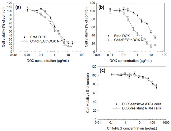 Anticancer activity of DOX and ChitoPEGthDOX nanoparticles (ChitoPEGthDOX NP) against DOX-sensitive AT84 cells (a) and DOX-resistant AT84 cells (b). The ChitoPEG copolymer, as an empty carrier, was treated to DOX-sensitive and DOX-resistant AT84 cells (c).