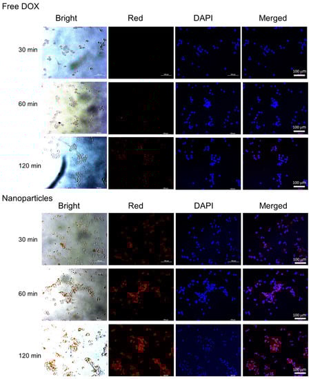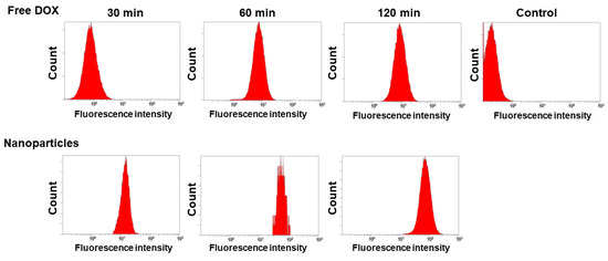 Flow cytometry analysis was performed as follows: DOX-resistant AT84 cells (1 × 106 cells) were treated with free DOX or nanoparticles (5 µg/mL DOX concentration) for 0.5~2 h. After that, the cells were washed with PBS twice, and then harvested via centrifugation. Flow cytometry analysis was performed using Invitrogen Attune NxT flow cytometers (ThermoFisher Scientific, Waltham, MA, USA).