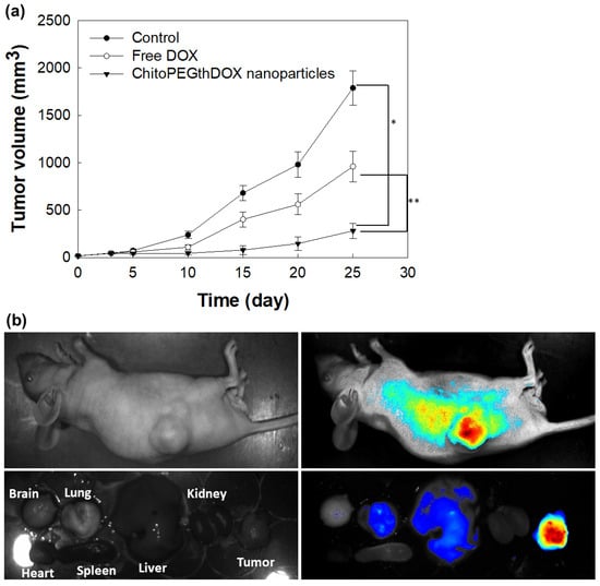 The particle size is known to govern the fate of the nanoparticles biologically [30,31,32]. He et al. reported that the particle size of nanoparticles governs in vivo fate after administration [31]. The authors argued that nanoparticles with a particle size of 150 nm were efficiently accumulated in tumor tissues. Notably, Caster et al. reported the importance of the particle size of nanoparticles in chemoradiotherapy, i.e., nanoparticles with diameters of 100 nm resulted in the smallest tumor growth rate compared to nanoparticles of 50 nm or 150 nm diameters [32]. Furthermore, the authors argued that the smallest nanoparticles do not promise the best anticancer activity even though they are effective when it comes to avoiding hepatic and splenic accumulations [32]. Our nanoparticles have a small diameter of approximately 100 nm (Figure 4 and Table 1), which is a suitable particle size for site-specific targeting of tumor tissues and for promising anticancer activity. For in vivo study, DOX-resistant AT84 cells were implanted into the back of mice and the antitumor activity of ChitoPEGthDOX nanoparticles was evaluated (Figure 9). As shown in Figure 9a, the tumor volume gradually increased in the control treatment. DOX treatment inhibited tumor growth more significantly compared to control treatment. Importantly, tumor growth was efficiently inhibited by ChitoPEGthDOX nanoparticles, and the tumor volume was smallest among all the treatment groups, i.e., the tumor volume of the ChitoPEGthDOX nanoparticle treatment was less than 50% compared to the free DOX treatment. These results indicated that ChitoPEGthDOX nanoparticles have superior antitumor activity compared to free DOX. Figure 9b supported these results, i.e., the fluorescence intensity was significantly stronger in tumor tissues. Furthermore, the strongest fluorescence intensity was observed in the tumor tissues of all organs. These results indicated that ChitoPEGthDOX nanoparticles can efficiently target tumor tissues, thus inhibiting the growth of the tumor.
