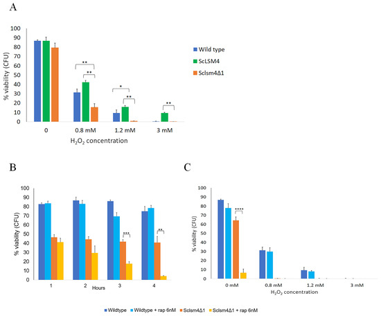 Then, we explored if low doses of rapamycin could protect cells from hydrogen peroxide-induced cell death. As shown in Figure 3C, the presence of 6 nM rapamycin did not protect wild-type cells from oxidative stress, as the differences in viability of the treated and untreated samples after exposure to different concentrations of H2O2 were not statistically significant. On the other hand, it was not possible to evaluate the protective action of rapamycin in the Sclsm4Δ1 mutant due to its high toxic effect. Similar results were obtained using lower doses of H2O2 as described in [44], confirming that the low dose of rapamycin used in this work is not sufficient to protect the aging-induced oxidative stress in the tested strains (Supplemental Figure S5).