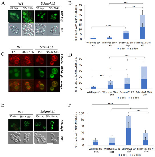After 16 h of nitrogen starvation (Figure 4C, SD-N 16 h), the GFP is predominantly found in the vacuole in the wild-type cells, confirming the active autophagic flux, with only a slight increase in cells showing cytoplasmic dots, while about 35% of Sclsm4Δ1 mutant cells showed cytoplasmic dots, and half of them presented two or more dots per cell (Figure 4D) and very low intravacuolar fluorescence.