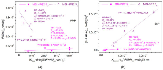(a) WHP and (b) SSP graphs, constructed for the reflections of MBI-PG2.5L and MBI-PG2.5M crystalline phases of the MBI-PG2.5 sample. In (a,b), FWHM and FWHMcorr are FWHM values without and with correction to instrumental broadening, respectively; Kstrain = 4 and KScherrer = 0.94 (see Section 3.2.2); θB is half of Bragg angle 2θB corrected to zero shift and displacement (Section 3.2.2); dhkl is interplane distance corresponding to XRD reflection with Miller indices hkl and Bragg angle 2θB; λ = 0.15406 nm is wavelength of Cu-Kα1 radiation used (after correction to Cu-Kα2 contribution). The straight approximating lines Y = A + B∙X of the WHP and SSP are shown in (a,b). Expressions for X and Y are given in axes captions of WHP and SSP graphs.
