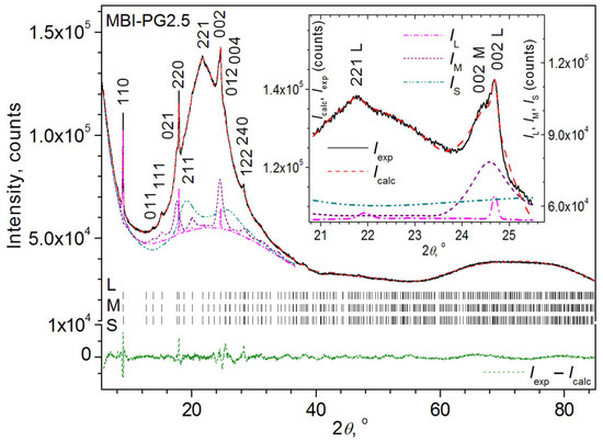 Sample MBI-PG2.5. The results of the Rietveld fit within the three-phase model MBI-PG2.5L + MBI-PG2.5M + MBI-PG2.5S. The MBI-G2.5L, MBI-PG2.5M, and MBI-PG2.5S phases are designated as L, M, and S, respectively. The positions of the phase reflections calculated from the unit cell parameters refined by the Rietveld method are shown as vertical bars below. In addition to the experimental (Iexp), calculated (Icalc), and difference (Iexp − Icalc) diagrams, the calculated XRD patterns (together with the background contribution) corresponding to individual crystalline phases are shown in the region 2θ = 6–37°. The Miller indices hkl of some selected observed reflections are indicated. The inset shows, on an enlarged scale, part of the diagrams in the region of reflections 221 and 002 of the MBI phases.