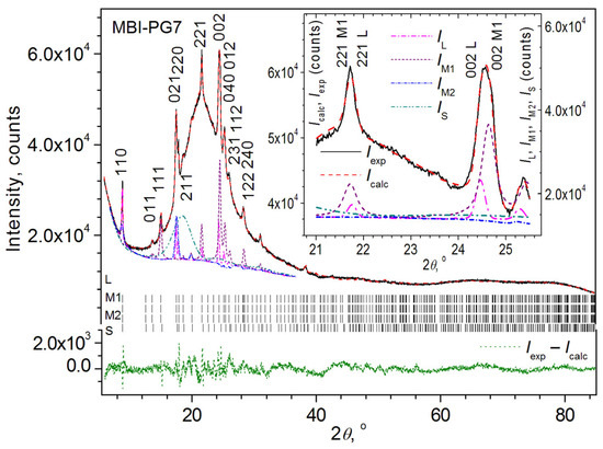 The graphical results of the Rietveld fit carried out within the framework of the four-phase model (MBI-PG7L + MBI-PG7M1 + MBI-PG7M2 + MBI-PG7S) are shown in Figure 5. The quantitative results are summarized in Table 2.