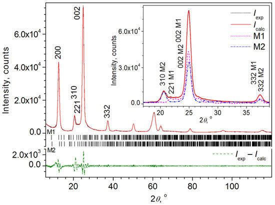 Sample MBI-ChA. Results of the LB fit in frames of the two-phase MBI-ChA1 + MBI-ChA2 model. The MBI-ChA1 and MBI-ChA2 phases are designated as M1 and M2, respectively. Other details are the same as in the caption to Figure 4. The positions of the phase reflections calculated from the unit cell parameters refined by the LB method are shown as vertical bars below. The experimental, calculated, and difference diagrams are marked as Iexp, Icalc, and Iexp − Icalc, respectively. The Miller indices, hkl, of some selected observed reflections are indicated. The inset shows the experimental and calculated XRD patterns and calculated diagrams (together with the background contribution) corresponding to individual crystalline phases in the region 2θ = 17–39°.