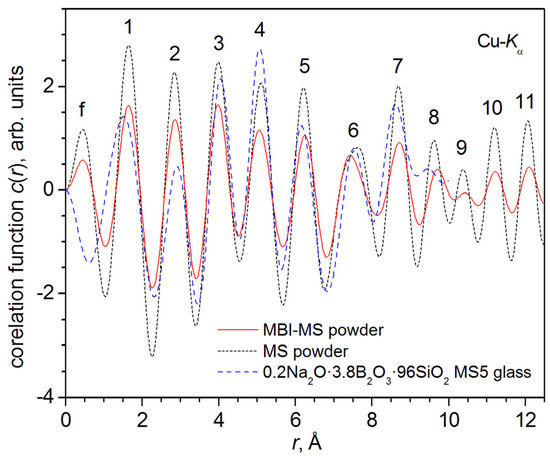 Therefore, to detect MBI, total correlation functions c(r) were built for the experimental XRD patterns of the MBI-MS and pure MS according to the method from [44] (Section 3.2.5 and Section S2 of Supplementary Materials).