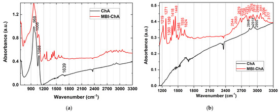 In the MBI-ChA sample, in addition to ChA peaks, two groups of lines in the ranges of 1200–1750 cm−1 and 2500–3200 cm−1 are observed in the spectrum, and are associated with vibrations in the MBI molecules [45,46]. Table 4 shows the positions of the main absorption peaks and their interpretations from [46].