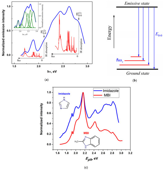 In such a case, an emission spectrum is expected to consist of the band of a purely electronic transition at energy E0−0 and its vibrational replicas at energies Ei = E0−0 − ħωi, where ħωi is the energy of the i-th vibration (phonon) involved in the transition (Figure 9b). The spectral contour of MBI emission shown in Figure 9a indicates the presence of at least seven overlapping bands (inset in Figure 9a). Figure 9a also shows the IR vibrational spectra of MBI (according to [45]). As can be seen, there is an obvious correlation of the positions of the vibronic emission bands with the vibrational spectrum of the crystal. The best agreement between the considered model of vibronic optical transitions and the vibrational spectrum of the crystal is achieved by assuming the existence of two emission centers (emissive states) in the crystal with energies of purely electronic transitions, and (Figure 9a).
