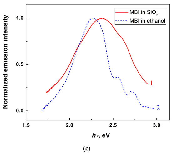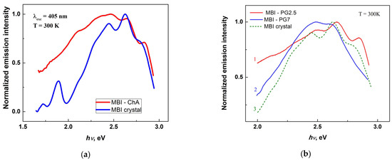 The spectrum consists of a series of broad overlapping bands occupying almost the entire visible region. To our knowledge, the energy gap, Eg, in MBI crystals is unknown. On the other hand, a sharp increase in optical absorption in the MBI solution in ethanol, which can be related to the highest occupied molecular orbital-lowest unoccupied molecular orbital (HOMO-LUMO) transitions in MBI molecules, was found to start at a photon energy with hν ≥ 3.8 eV. Apparently, this value can be considered in the first approximation as an estimate of the Eg value in MBI crystals. Therefore, the emission of MBI crystals observed in the region hν < 3 eV (Figure 9a) should be ascribed to the recombination of free or localized excitons (hereafter referred to as emission centers). The observed structure of the emission spectrum can be due to electron transitions from excited emissive states in the MBI crystal to vibrationally excited substates of the ground electronic state (Figure 9b).