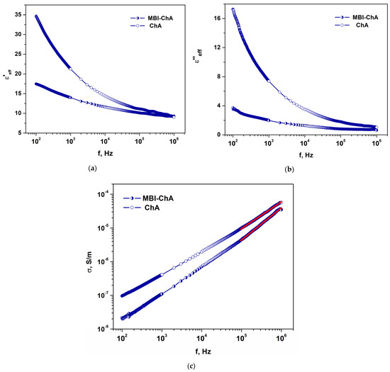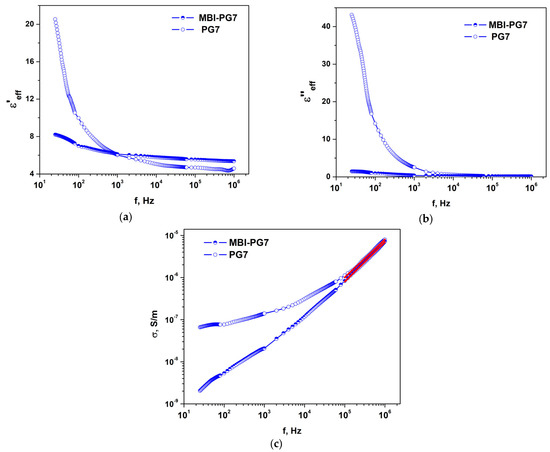 Third, bulk MBI samples demonstrate ferroelectric properties above room temperature [29,31], almost up to the melting point, because the Curie temperature of MBI at normal pressure is close to or above the melting point [29]. Spontaneous polarization Ps in MBI occurs in directions of the [110]tetra type, perpendicular to the pseudotetragonal axis [001], and amounts to Ps ~5 μC/cm2. Dielectric hysteresis loops at room temperature show coercive fields Ec ~2–3 V/μm. An important property of MBI is the ability to switch polarization in different directions, perpendicular to the pseudotetragonal axis, by weak fields [29,31,32]. Therefore, it was interesting to see how the inclusion of MBI molecules affected the dielectric properties of the matrices.