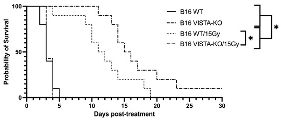 Kaplan–Meier curve demonstrating tumor control of flank B16 in the VISTA KO model. Kaplan–Meier survival curves are shown for wildtype control (WT Control), VISTA knockout control (VISA KO Control), wildtype + 15Gy radiation (WT/15Gy), and VISTA knockout + 15Gy radiation (KO/15Gy) groups. WT Control and VISTA KO Control groups do not differ in survival. Irradiated groups (WT/15Gy and VISTA-KO/15Gy) survived significantly longer than either non-irradiated control (p ≤ 0.037), and VISTA-KO/15Gy improved survival significantly compared to WT/15Gy (p < 0.05). * = p < 0.05.