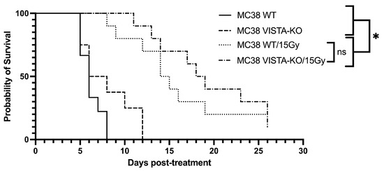 Kaplan–Meier curve demonstrating tumor control of flank MC38 in the VISTA KO model. Kaplan–Meier survival curves are shown for wildtype control (WT Control), VISTA knockout control (VISA KO Control), wildtype + 15Gy radiation (WT/15Gy), and VISTA knockout + 15Gy radiation (KO/15Gy) groups. WT Control and VISTA KO Control groups do not differ in survival. WT/15Gy and VISTA-KO/15Gy are both significantly different from either control (p < 0.05), but not from each other. * = p < 0.05, ns = not significant (p > 0.05).
