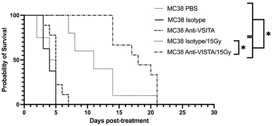 Kaplan–Meier curve demonstrating tumor control of flank MC38 in the anti-VISTA model. Kaplan–Meier curve for mice for either isotype control or anti-VISTA antibody with or without 15Gy radiation is shown, in addition to a PBS control group. Irradiated isotype and anti-VISTA groups differ significantly from non-irradiated groups. Moreover, the isotype/15Gy and anti-VISTA/15Gy differ significantly with p < 0.01. * = p < 0.05.