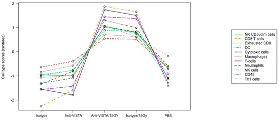 Immune cell abundance (mRNA) in B16 melanoma tumor. The RNA data (mRNA) demonstrate that VISTA blockade with radiation leads to increased cytotoxic immune cell presence in B16 melanoma tumor. Raw cell scores for an array of immune cell types for the different treatment cohorts. Activated T cells and NK cells (CD8 and CD56dim) were slightly higher in the anti-VISTA/15Gy than the isotype/15Gy cohort.