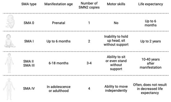 SMA4 (OMIM 271150) is the mildest form, occurring in adults after 18 years of age and presenting with mild proximal limb weakness. The extremely rare form of the disease occurs after 30 years of age. Patients retain motor function and have a normal life expectancy [11] (Figure 1).