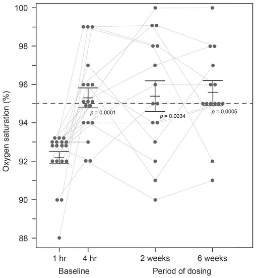 SpO2 levels were compared pre-dose and after four hours in the clinic following the administration of a single dose of HMTM at 4 mg or doses of 75, 100 or 125 mg (summarised as the mean, 100 mg, for the high doses; Figure 1). As can be seen in Figure 1, HMTM at a dose of 4 mg substantially increased mean blood oxygen saturation levels. Mean oxygen saturation in the group with baseline SpO2 levels below 94% was 91.71%. Four hours after receiving a 4 mg dose of HMTM, the mean SpO2 level was increased to 95.43% (+3.72%, p = 0.0205; Table 3, Figure 1). Likewise, following the administration of high-dose HMTM, oxygen saturation levels increased from 92.45% at baseline to 95.27% after four hours (+2.82%, p = 0.0045; Table 3, Figure 1). Therefore, HMTM is able to increase blood oxygen saturation within 4 h across a broad range of doses with no discernible dose-dependent differences. As can be seen from Figure 2 and Table 4, the effect is stable over 6 weeks at 8 mg/day and 150–250 mg/day, and the differences with respect to baseline were statistically significant at week 2 (+3.17%, p = 0.0034) and week 6 (+3.23%, p = 0.0005). Therefore, HMTM produces a rapid improvement in oxygen saturation at single doses in the range 4–125 mg, and this is sustained over 6 weeks at doses in the range 8–250 mg/day.