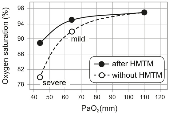 We have used a standard clinical SpO2 to PaO2 conversion table (e.g., https://www.acphospitalist.org/archives/2013/11/acph-201311-coding_t1.pdf (accessed on 21 August 2023)) to compare the oxygen–haemoglobin dissociation curves in patients receiving HMTM or those receiving a reduced form of MTC [17] with normal. For patients treated with HMTM, implied PaO2 values at baseline and corresponding SpO2 values were plotted. After treatment with HMTM, the SpO2 values were plotted at the same PaO2 values to deduce the implied shift in the dissociation curve. In order to compare these treatment effects with those reported by Hamidi Alamdari and colleagues (2021) [17], SpO2 values observed in patients receiving standard of care were used to calculate the implied untreated PaO2 values. The SpO2 values observed after 5 days of treatment with the reduced MTC preparation were plotted at the same PaO2 values to infer the implied shift in oxygen–haemoglobin dissociation.