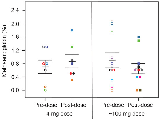Changes in metHb levels in patients receiving HMTM, comparing pre-dose and after four-hours (post-dose) following administration of single doses of HMTM at 4 mg and high doses (75/100/125 mg indicated as the mean dose, 100 mg). Data represent mean (%) ± S.E., with p = 0.5472 and p = 0.2390 in the 4 mg dose group and ~100 mg dose group, respectively. Colour coding matches that for subjects in Figure 1.