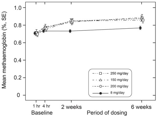 Alterations in metHb levels in patients receiving low (8 mg/day) and high doses (150 mg, 200 mg and 250 mg/day) of HMTM over a 6-week period. Data represent mean (%) ± S.E. Statistical analysis relating to this graph is provided in Table 5.