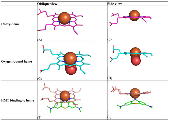 Computational chemistry modelling of the high-affinity HMT/MT+–heme interaction. (A,B) Heme in the nonplanar unbound T-state showing protrusion of the iron atom (brown) above the plane of the porphyrin ring. (C,D) Heme in the flat oxygen-bound R-state (oxygen shown as two red molecules). (E,F) Heme adopting the R-state with HMT (green).