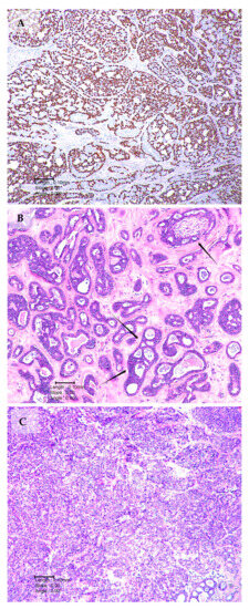 - Andreasen, S.; Tan, Q.; Agander, T.K.; Steiner, P.; Bjørndal, K.; Høgdall, E.; Larsen, S.R.; Erentaite, D.; Olsen, C.H.; Ulhøi, B.P.; et al. Adenoid cystic carcinomas of the salivary gland, lacrimal gland, and breast are morphologically and genetically similar but have distinct microRNA expression profiles. Mod. Pathol. 2018, 31, 1211–1225. [Google Scholar] [CrossRef]