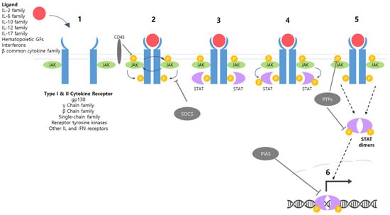 Schematic illustration of the JAK/STAT signaling pathway. Ligand binding to cytokine receptor leads to the formation of receptor dimerization (1). The dimerization induces the transphosphorylation of JAK as well as phosphorylation of the cytoplasmic tails of the receptors (2). STAT binds to the phosphorylated site of the receptor (3). Subsequently, JAK phosphorylates STAT recruited to the receptors (4). Phosphorylated STATs dissociate from the receptors and form a dimer (5). STAT dimers translocate into the nucleus and induce the transcription of target genes (6). There are three types of negative regulators of the JAK/STAT signaling: suppressors of cytokine signaling (SOCS), inhibiting the phosphorylation of the receptor by JAK; protein inhibitors of activated STAT (PIAS), preventing the activity of STAT transcription factors; and protein tyrosine phosphatases (PTPs), removing phosphate groups from JAKs and STATs.