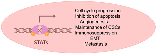 The JAK/STAT pathway is a vital cellular cascade that controls a wide range of processes, including cell proliferation, differentiation, and apoptosis [16,17]. Its significance is particularly pronounced in modulating immune and inflammatory responses [18,19]. Additionally, it plays a role in hematopoiesis and the functioning of hematopoietic stem cells (HSCs) [20,21,22]. Notably, the JAK/STAT pathway contributes to diverse liver functions, such as hepatic proliferation, regeneration, hepatoprotection, and metabolic processes such as gluconeogenesis [23,24]. This signaling pathway also plays a crucial role in various stages of tumorigenesis, including epithelial–mesenchymal transition (EMT) and metastasis. Moreover, it is highly associated with the generation and maintenance of cancer stem cells (CSCs), which play pivotal roles in therapy resistance and metastasis [25,26].