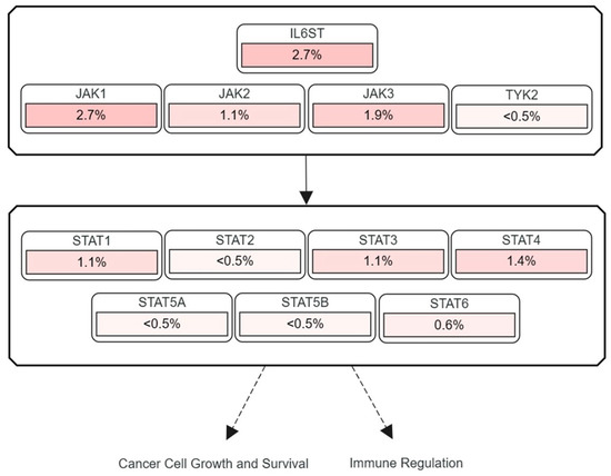 Frequencies of mutations in genes encoding JAK and STAT proteins in HCC. The highest mutation frequencies are observed in IL6ST (encoding the gp130 receptor) and JAK1 among genes encoding major components of the JAK/STAT pathway.