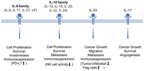 The livers of HCC patients are often infiltrated with different types of inflammatory cells that secrete various types of cytokines, growth factors, chemokines, and other molecules [50,112]. Dysregulated production of inflammatory cytokines is considered a major trigger for HCC carcinogenesis and tumor progression [113]. Among the numerous inflammatory cytokines associated with the activation of the JAK/STAT signaling in HCC, this review focuses on IL-6 family cytokines, IL-10 family cytokines, IL-23 as a member of IL-12 family cytokines, and IL-17, which play critical roles in the pathogenesis of HCC (Figure 4).