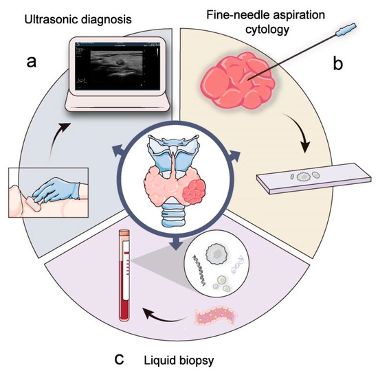 Clinical examination and diagnosis of thyroid cancer. Ultrasound (a) and fine-needle aspiration biopsy histology (b) are commonly used methods for detection and diagnosis of thyroid cancer. Liquid biopsy (c) offers a new approach to diagnosis.