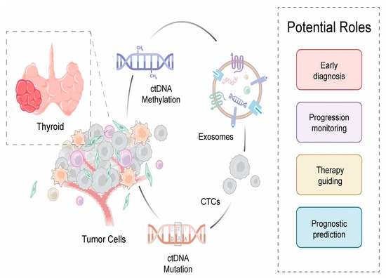 Considering this and given the above-highlighted aspects, this article gives a review of how liquid biopsy components have progressed in thyroid cancer. We also discuss the clinical potential of liquid biopsy in thyroid cancer and provide a reference for liquid biopsy research (Figure 2).