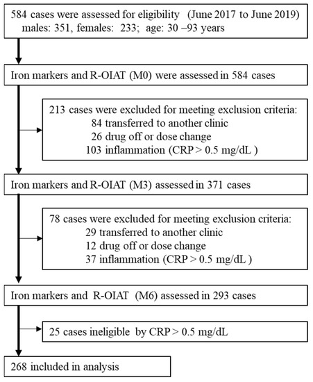 A total of 268 patients were included in the R-OIAT (Figure 1). Between 1 June 2017 and 1 June 2019, 584 hemodialysis patients using FCH as a phosphate binder were enrolled in the R-OIAT. According to the exclusion criteria, 213 and 78 participants were excluded at 3 months (M3) and 6 months (M6), respectively. The numbers of patients with a serum C-reactive protein (CRP) level > 0.5 mg/dL at baseline (M0), M3, and M6 were 103, 37, and 25, respectively. Finally, 268 patients who continued to receive a fixed amount of FCH for 6 months were analyzed. The trial concluded in June 2020. The baseline characteristics of the participants are shown in Table 1. The mean age of the participants was 63.0 years (SD, 11.7), 57% of patients were male, 55.6% received 750 mg of FCH, and 49.6% were injected with darbepoetin alfa.