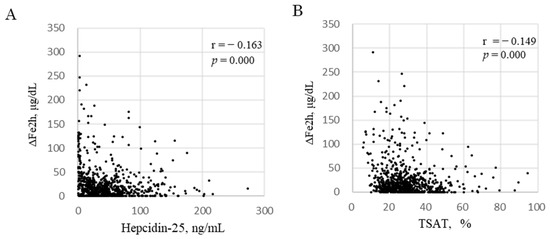 Generalized estimating equations (GEEs) were used to identify the determinants of ΔFe2h during each phase of FCH treatment: M0, M3, and M6. ΔFe2h was affected by hepcidin-25 and TSAT (Table 4). Log ΔFe2h increased by 0.459 μg/dL per 1 ng/mL decrease in Log hepcidin-25 [95% CI: −0.643 to −0.276, p = 0.000] and increased by 0.648 μg/dL per 1 % decrease in Log TSAT [95% CI: −1.099 to −0.197, p = 0.005]. Hb levels were excluded because of collinearity with respect to RBCs based on the formula Hb = RBC × MCH. In the three datasets of iron markers per patient at M0, M3, and M6 (n = 804), there were significant negative correlations of ΔFe2h with hepcidin-25 (r = −0.163, p = 0.000, Figure 2A) and TSAT (r = −0.149, p = 0.000, Figure 2B).