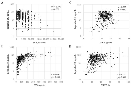 Predictors for hepcidin-25 were analyzed via GEEs using iron variables, excluding ΔFe2h (Table 5). Hepcidin-25 was affected by RBC, MCH, TSAT, FTN, and ESA. Log hepcidin-25 decreased by 0.790 ng/mL per 1 × 104/μL decrease in Log RBC [95% CI: 0.178 to 1.401, p = 0.011]; by 1.667 ng/mL per 1 pg/cell decrease in Log MCH [95% CI: 0.121 to 3.213, p = 0.035]; by 0.372 ng/mL per 1 % decrease in Log TSAT [95% CI: 0.144 to 0.600, p = 0.001]; by 0.754 ng/ml per 1 ng/mL decrease in Log FTN [95% CI: 0.637 to 0.871, p = 0.000]; and by 0.353 ng/mL per 1 IU/week increase in Log ESA [95% CI: −0.462 to −0.245, p = 0.000]. In the three datasets of iron markers per patient at M0, M3, and M6 (n = 804), there were significant correlations between hepcidin-25 and ESA (r = 0.201, p = 0.000, Figure 3A), FTN (r = 0.646, p = 0.000, Figure 3B), and TSAT (r = 0.278, p =0.000, Figure 3D). An increase in FTN up to 100 ng/mL was accompanied by an increase in hepcidin-25, but even if FTN increased beyond that level, no increase in hepcidin-25 was observed, as if there was an upper limit for hepcidin expression. MCH had no significant correlations with hepcidin-25 (r = 0.065, p = 0.063, Figure 3C).