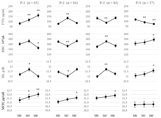 Changes in FTN and iron variables every three months (n = 268). Patients were classified into four groups based on 3-month changes in FTN from M0 to M3 or from M3 to M6 (denoted as ΔFTNM3-M0 and ΔFTNM6-M3, respectively); P-1 (ΔFTNM3-M0: positive; ΔFTNM6-M3: positive; n = 63), P-2 (ΔFTNM3-M0: positive; ΔFTNM6-M3: negative; n = 84), P-3 (ΔFTNM3-M0: negative; ΔFTNM6-M3: positive; n = 84), and P-4 (ΔFTNM3-M0: negative; ΔFTNM6-M3: negative; n = 37). FTN, Ferritin; RBCs, red blood cells; Hb, hemoglobin; MCH, mean corpuscular hemoglobin. Data are shown as means ± SEM of samples. The levels of iron variables at M0 were compared with those at M3 and M6. * p < 0.05. ** p < 0.001.