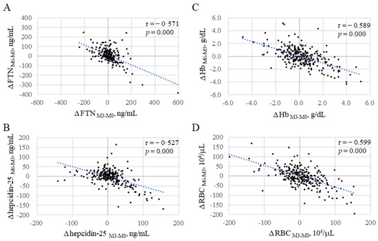 Inverse correlations between the changes in iron variables from M0 to M3 and those from M3 to M6 (black dots, n = 268). (A): ΔFTNM3-M0 vs. ΔFTNM6-M3; (B): ΔRBCM3-M0 vs. ΔRBCM6-M3; (C): ΔHbM3-M0 vs. ΔHbM6-M3; (D): ΔHEPM3-M0 vs. Δhepcidin-25M6-M3. Only 63 cases (23.5%) were positive for both ΔFTNM3-M0 and Δ FTNM6-M3. ΔM3-M0: Changes from M0 to M3; ΔM6-M3: changes from M3 to M6. FTN, ferritin; Hb, hemoglobin; RBCs, red blood cells. The blue dotted line describes the regression line.