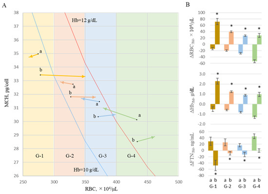 To analyze the effect of the change in RBCs counts on FTN values over 3 months, the levels at M0 and M3 were treated as starting points for the first and second 3-month periods, and levels at M3 and M6 were treated as 3-month points, respectively. Two datasets of iron variables were evaluated equally, and the changes in iron variables over 3 months were represented as Δ3M (n = 536). Each datum was classified into four groups, G-1, G-2, G-3, or G-4, according to the RBC value at start points M0 or M3; RBC ≤ 300: 300 < RBC ≤ 350, 350 < RBC ≤ 400, and RBC > 400 × 104/μL, respectively. Furthermore, each case was classified into G-a when each ΔRBC3M was negative and into G-b when ΔRBC3M was positive. The start and end points were vectorized as the mean values of MCH and RBCs (Figure 6A). In any RBC region, changes in FTN for 3 months in each group decreased in the increased RBC group (b) and increased in the decreased RBC group (a) (Figure 6B).
