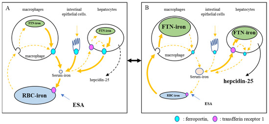 Model of crosstalk between the erythropoietic system and iron metabolic system. The stimulation of erythropoiesis by ESA is a trigger for crosstalk. When ESA stimulates hematopoiesis (A), serum iron is rapidly consumed and decreases. This triggers a decrease in the expression of hepcidin-25. Iron is then supplied from iron-store cells via FPN. If the supply of iron recovered from senescent red blood cells alone is inadequate, stored iron is consumed. This phenomenon appears to be a shift from FTN iron to RBC iron. In this situation, iron is readily absorbed from the intestinal tract. When erythropoiesis decreases due to the limitation of ESA (B), serum iron increases because of reduced iron consumption in bone marrow, and hepcidin-25 also increases. As a result, the iron supply to blood is suppressed, and unsupplied iron is stored in cells. Iron recovered from senescent red blood cells is also stored. This appears to be a shift from RBC iron to FTN iron. In this situation, iron absorption from the intestinal tract is suppressed. FTN, ferritin; ESA, erythropoiesis-stimulating agent; RBCs, red blood cells.