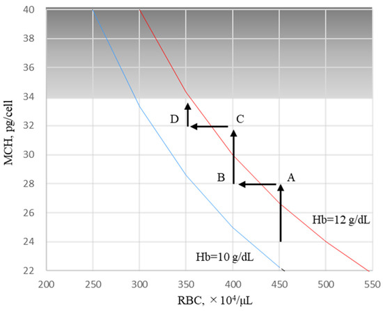 Hypothesis of Hb adjustment shown in the RBC/MCH diagram during FCH therapy. When the Hb level is ≥12 g/dL, ESA is arbitrarily reduced, and Hb levels are adjusted between 10 and 12 g/dL according to the guidelines. Hb level, which was 13 g/dL in RBC 450 × 104/μL (MCH 28.9 pg, point A), was reduced to 11.6 g/dL when reducing ESA and resetting RBCs to 400 × 104/μL (point B). During this period, the FTN level increased because RBC iron’s capacity decreased, and the corresponding amount of iron shifted to FTN iron. When FCH administration was continued, MCH increased with iron absorption, and Hb levels easily exceeded 12 g/dL (RBC to 400 × 104/μL, MCH 32.5 pg, point C). If ESA was reduced again and RBCs reset to 350 × 104/μL, Hb levels improved to 11.4 g/dL (point D) with another increase in the FTN level. When RBCs are ≤ 350 × 104/μL, there is little risk of Hb being ≥12 g/dL even if FCH therapy is continued because there is an upper limit against MCH, which falls normally within the range of 27–33 pg. At this stage, there is no need to further reduce the ESA, and FTN reaches a plateau without increasing. Hb, hemoglobin; RBCs, red blood cells; MCH, mean corpuscular hemoglobin; FCH, ferric citrate hydrate; ESA, erythropoiesis-stimulating agent.