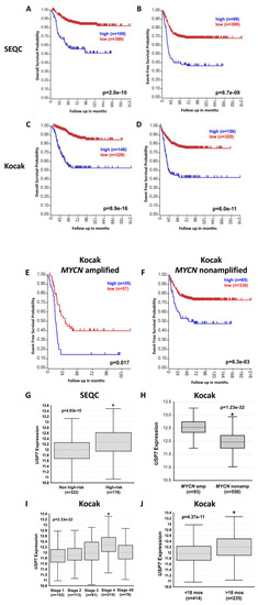 Neuroblastoma patient prognosis and outcomes impacted by USP7 expression. Using the Kocak and SEQC datasets from R2 Genomics Analysis and Visualization Platform (http://r2.amc.nl; accessed on 8 May 2020): (A,B) Kaplan–Meier curves depicting overall survival (OS; A) and event-free survival (EFS; B) among all NB patients in the SEQC database, separated by tumors with high expression (in blue) vs. low expression (in red) of USP7, with patient numbers in parentheses. (C,D) Kaplan–Meier curves depicting OS (C) and EFS (D) among all NB patients in the Kocak database, separated by tumors with high expression (in blue) vs. low expression (in red) of USP7, with patient numbers in parentheses. (E,F) Kaplan–Meier curves depicting EFS among NB patients in the Kocak database with tumors with amplified MYCN (E) and non-amplified MYCN (F), separated by tumors with high expression (in blue) vs. low expression (in red) of USP7, with patient numbers in parentheses. (G) Relative USP7 expression levels in tumors from the SEQC dataset were plotted in patients with high-risk and non-high-risk tumors (* p = 4.93 × 10−10). (H,I,J) Relative USP7 expression levels in tumors from the Kocak dataset were plotted in patients with MYCN-amplified and -nonamplified tumors (* p = 1.23 × 10−32) (H), with stages 1, 2, 3, 4, and 4S tumors (* p = 2.33 × 10−22, stage 4 vs. stages 1,2,3,4S) (I) and in patients more or less than 18 months of age at diagnosis (* p = 4.37 × 10−11) (J).
