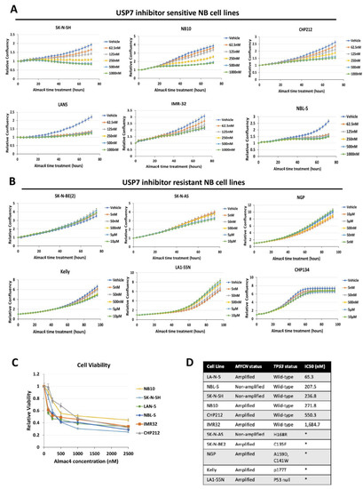 Efficacy of USP7 inhibition against neuroblastoma cell lines. (A,B) Relative cell confluence of Almac4-sensitive NB cell lines (A) SK-N-SH, NB-10, CHP-212, LAN-5, IMR-32, NBL-S compared to relative cell confluence of Almac4-resistant NB cell lines (B) SK-N-BE(2), SK-N-AS, NGP, Kelly, LA1-55N, CHP-134, that were each treated with DMSO control or increasing concentrations of Almac4 over time. Cell confluence was measured using continuous live-cell imaging over 72 h and normalized to control cell confluence. (C) Cell viability of sensitive NB cell lines determined by AlamarBlue assays performed after 72 h of treatment with Almac4 at increasing concentrations. (D) Molecular characteristics of all tested NB cell lines with calculated IC50 values from cell confluence curves shown in (A,B) above. TP53 mutation information was derived from published literature [19]. * IC50 could not be determined due to inability to achieve less than 50% cell viability in concentrations up to 10 µM.