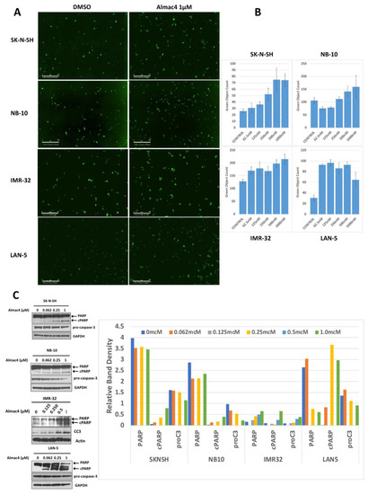 NB cells were plated in 96-well plates at a seeding density of 1 × 105 cells/well and incubated at 37 °C. Cells were then treated with increasing concentrations of Almac4 or equivalent doses of DMSO along with the Incucyte Caspase-3/7 Green Dye for Apoptosis (Essen BioScience, Ann Arbor, MI, USA) at 1:1000 concentration. Phase contrast and green fluorescence images were taken every 3 h using the Incucyte ZoomTM live cell imaging system. Green fluorescence images and the green object count per image were used for analysis. Statistical significance of observed changes in green object count was determined using single-factor ANOVA.