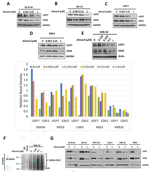 Prior studies have reported that USP7 stabilizes EZH2 via deubiquitination in different types of adult cancers [15,20,21]. To determine the relationship between USP7 and EZH2 in NB cell lines, we evaluated the effect of Almac4 on EZH2 protein expression. Almac4 treatment led to decreased EZH2 protein expression in tested NB cells (Figure 5A–D,F,G). Increasing Almac4 doses also induced an increase in EZH2 K48-ubiquitination (Figure 5E), confirming a role for USP7 in the ubiquitination of EZH2 in NB.