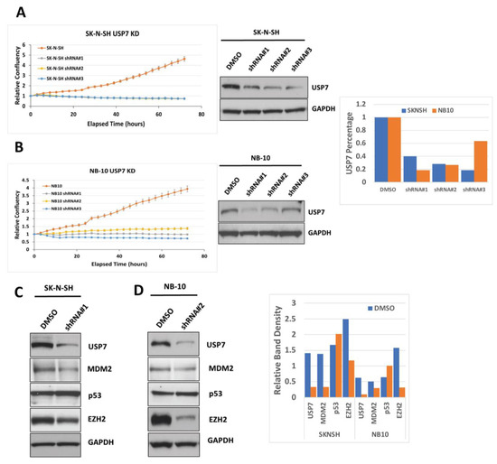 To further evaluate the roles of USP7 expression on NB cell growth, we established stable USP7 knockdown (KD) NB cell lines using three different USP7 shRNA plasmids. USP7 protein expression was significantly reduced in USP7 KD cell lines compared to the parental cell lines (Figure 6A,B). USP7 depletion also led to significantly reduced cell growth compared to the parental cell lines (Figure 6A,B). In addition, USP7 depletion led to decreased expression of both MDM2 and EZH2 and an increase in p53 protein expression (Figure 6C,D), similar to that seen with pharmacologic inhibition of USP7 and further supporting a role for USP7 in NB tumor growth via to its effect on USP7 deubiquitinase activity, allowing for target protein degradation.