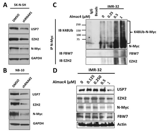 Impact of USP7 inhibition and depletion on expression and ubiquitination of N-myc. (A,B) Western blot analysis of USP7, EZH2 N-Myc, and GAPDH protein expression levels in SK-N-SH (A) and NB-10 (B) parental and USP7 knockdown NB cell lines. (C) IMR-32 NB cells were treated with DMSO or increasing concentrations of Almac4, and immunoprecipitated N-myc was analyzed by Western blot for lysine-48-linked (K48) ubiquitin, FBW7, and EZH2. (D) Cell lysates of IMR-32 NB cells treated with DMSO or increasing concentrations of Almac4 were analyzed by Western blot for USP7, EZH2, FBW7, N-Myc, and actin protein expression levels.